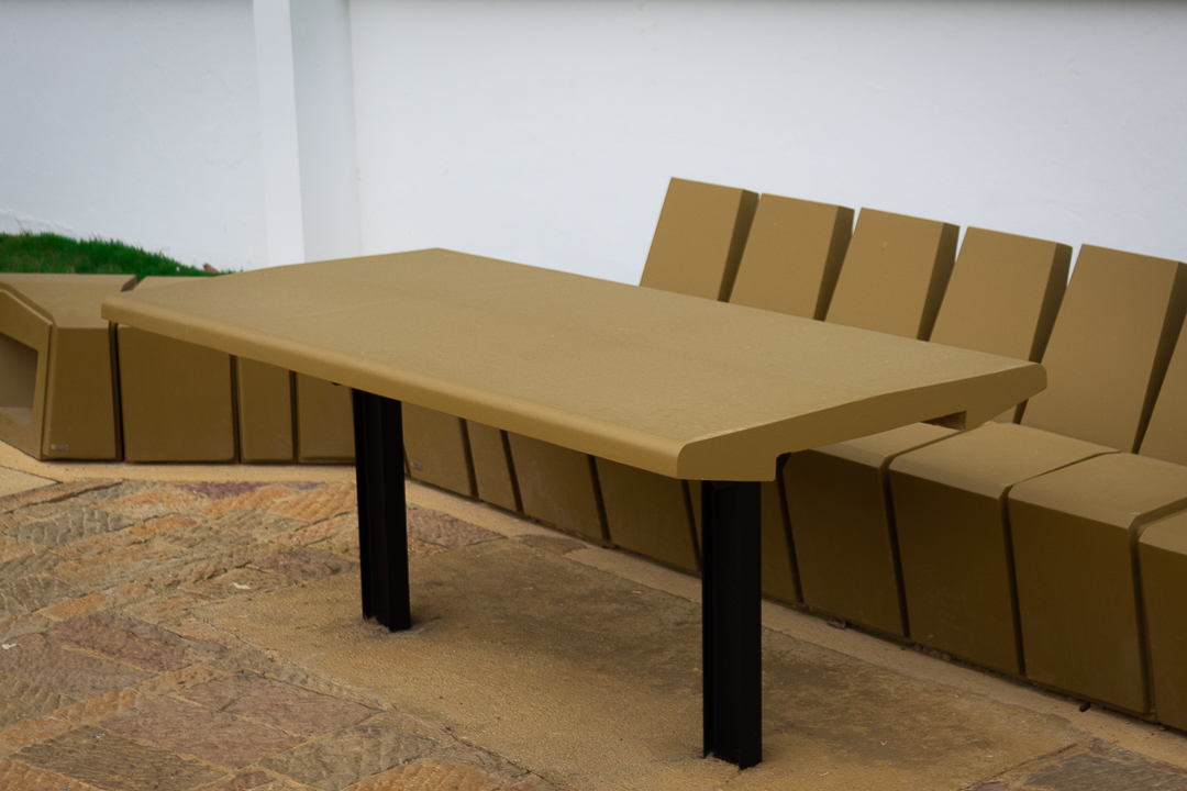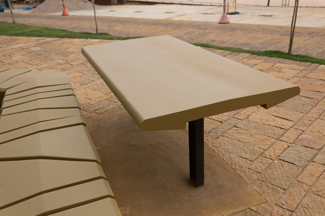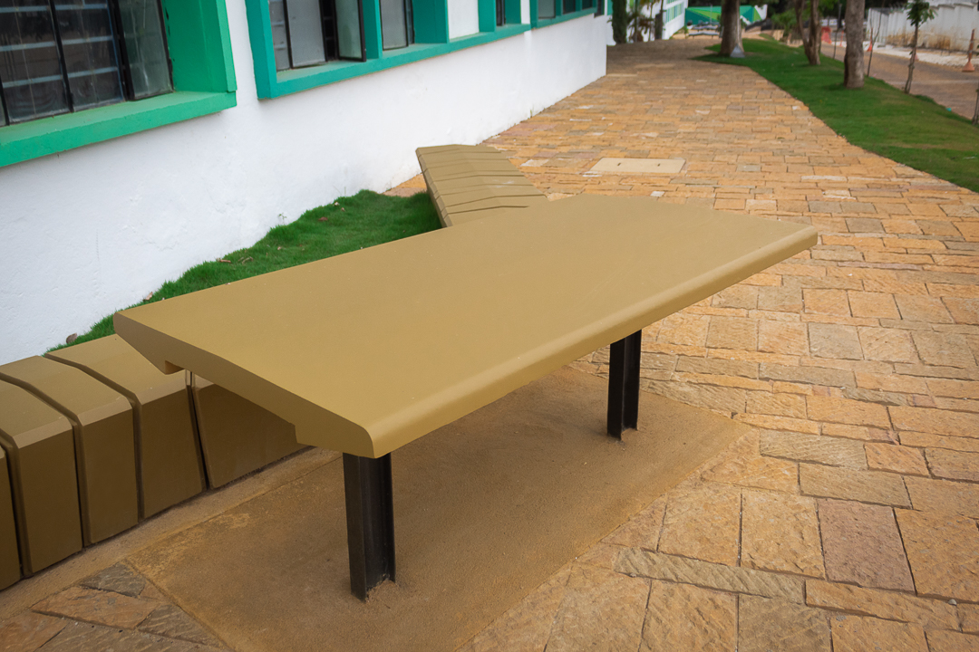 Elemento monolítico de tipo modular, de alta resistencia y bajo mantenimiento para sentarse y descansar por tiempos prolongados. Uso como elemento tanto decorativo como en áreas de ocio, esparcimiento y recreación, tales como plazoletas, alamedas y parques. Las bancas están orientadas a evitar cualquier obstrucción de la circulación en las zonas peatonales.
